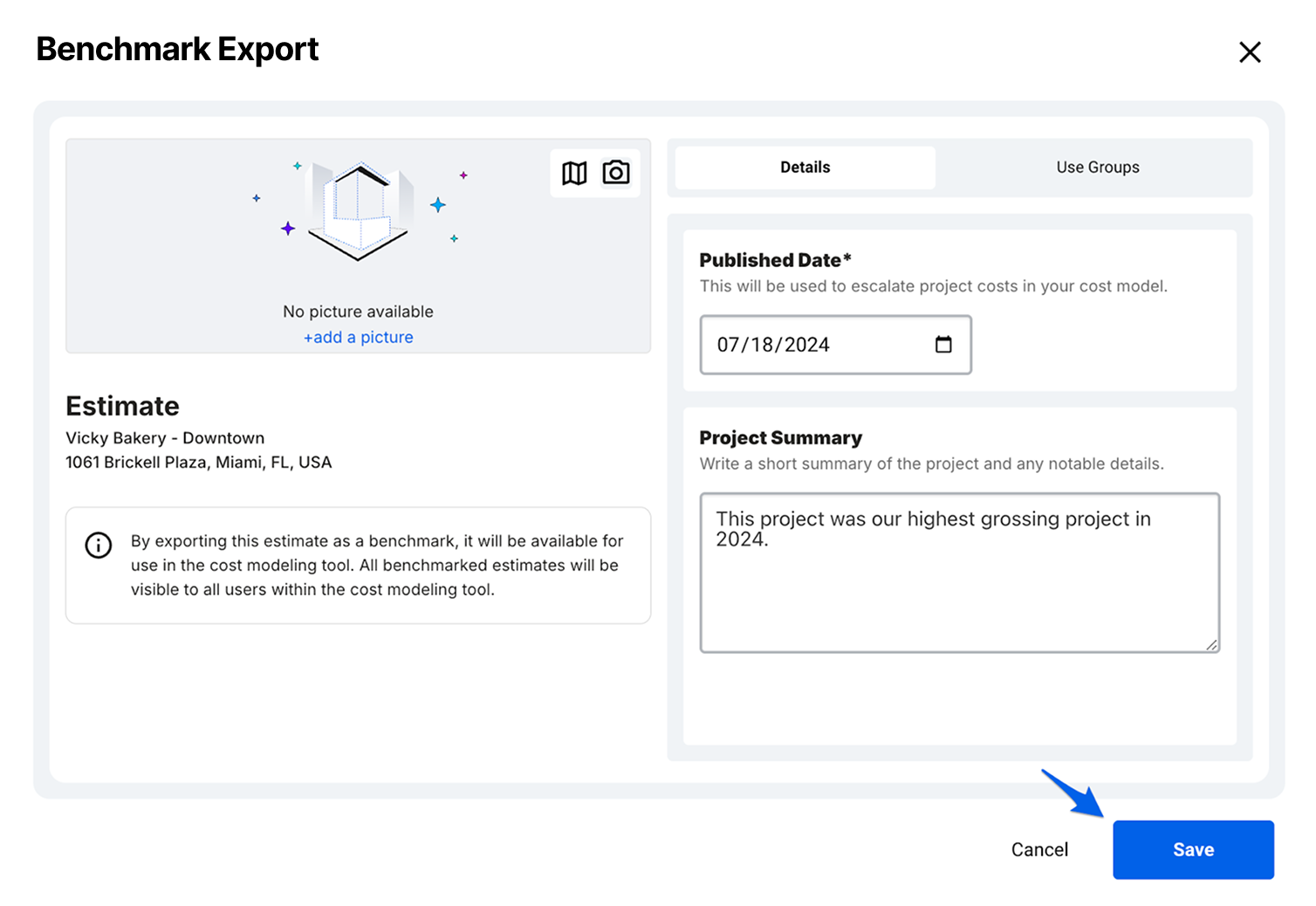 Benchmarking “archives” a finalized estimate so you can use it as a comparison project later. When you benchmark, you’ll also add helpful context like a published date and a short project summary.