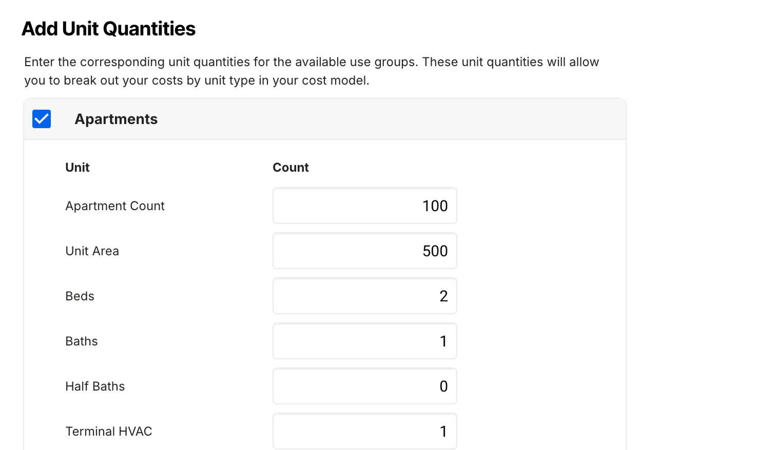 Ediphi will show the available Use Groups pulled from your benchmarks. Choose the ones you want in the model and enter the quantities for your current project (so the averages and cost/unit comparisons are meaningful).